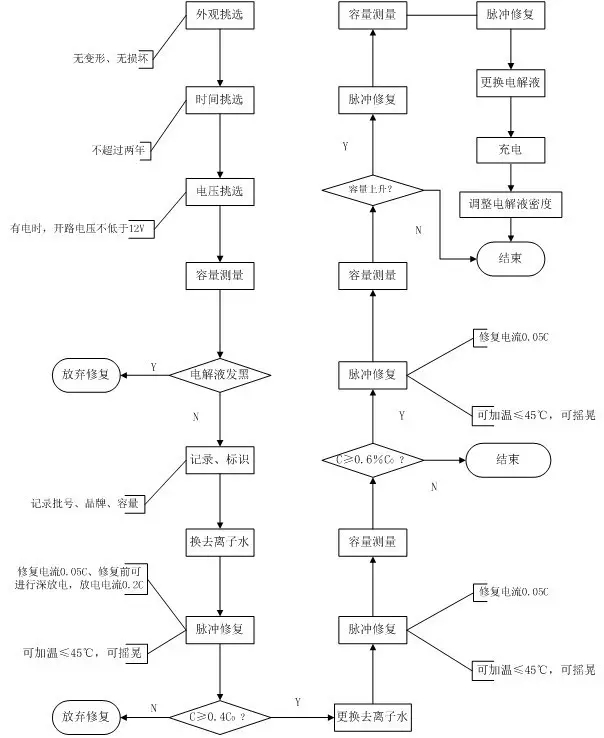 對于密封蓄電池一個基本的修復流程包括初步挑選、信息記錄、放電測量、補充液體,脈沖修復、測量判斷幾部分,使用脈沖法修復電池的修復流程見圖2;